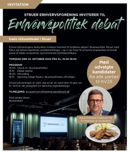 Struer Erhvervsforening inviterer til valgmøde den 23. oktober 2025 i BusinessPark Struer, hvor du får lejlighed til at møde de forskellige kandidater og partier, der
